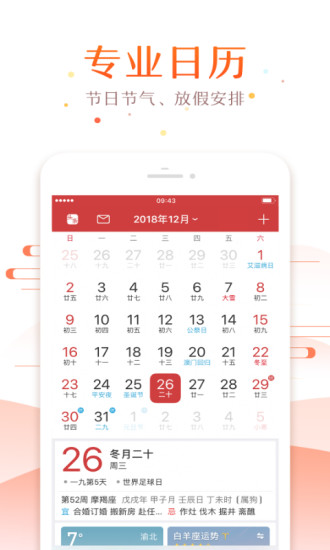 提供公历、农历、天气、日程、黄历、笔记,记事、生日、节日等日历实用功能。