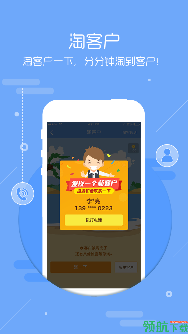每天为经纪人提供5条客户电话进行免费拨打,涵盖出售出租、求租求购4个方面,全方位解决经纪人房源客源难找的问题