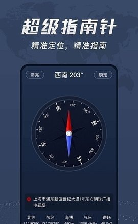 1、智能的超级指南针,具有真正的指南针的全部功能以及许多现代技术特征;