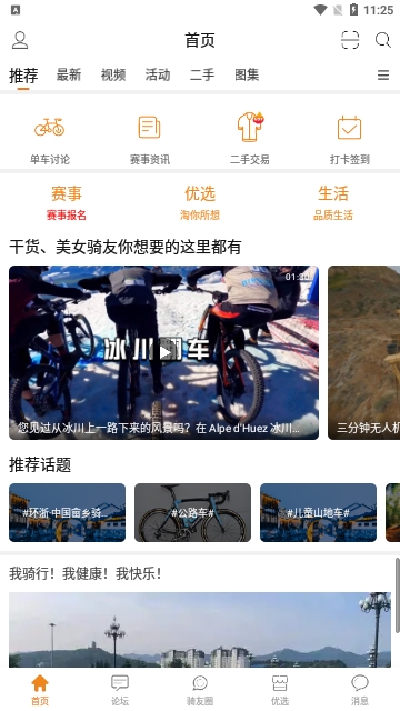 骑友网App中汇集了非常丰富的骑行资讯内容,还有各大赛事资讯可以了解到,同时有兴趣的还可以参加报名等等,超多骑行装备也可以购买,还提供二手交易,论坛、骑友圈都可以讨论交流,发现更多优质骑行路线,还可以分享到其中。