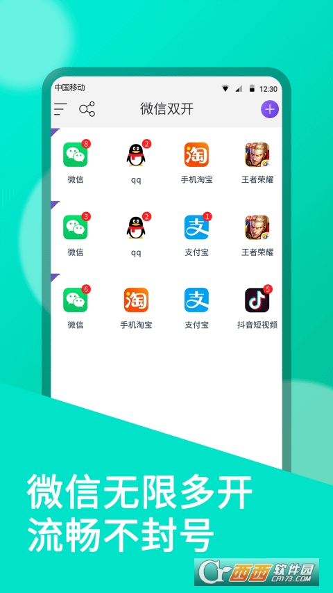 无限应用双开:不单支持微信,其他应用和游戏均能双开,如QQ、支付宝、淘宝、抖音、拼多多、王者等微双开/微多开/微分身。双开微信分身体验与官方微信一模一样,兼容微信最新版本,微信大号、微信小号同时在线,收发消息方便流畅不延迟!也支持企业微信、微信读书、微信表情等。
