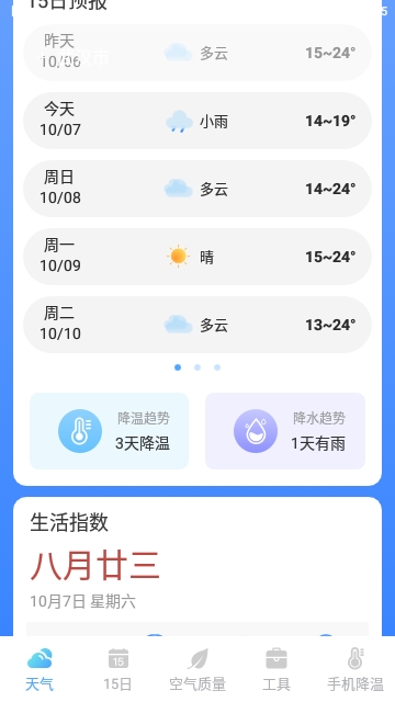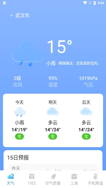 未来天气,未来的天气可以同步查询,可以观看到未来15天的详细天气温度。