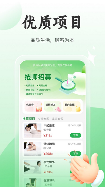 8号技师官方版是一款生活休闲服务平台,工作一天了,回到家想要放松放松,打开我们的8号技师软件挑选同城芳疗师,填写基本信息便可预约服务,解除一天的疲惫,专业的推拿服务,每一位技师都是经过专业培训的,安心下载使用,快来试试吧。