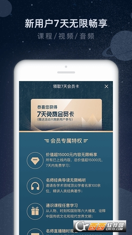 6.新注册用户可领取7天体验会员卡,免费畅享除「名师课程」外的一流通识好课。