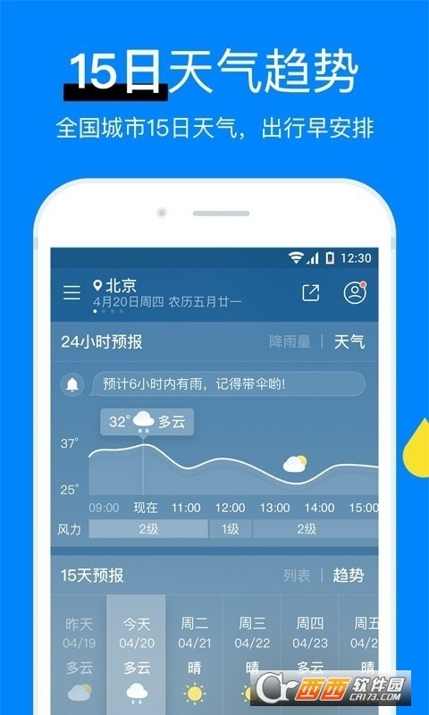 丰富天气信息:实时天气数据、未来24小时天气预报、15日天气预报、空气质量指数、空气污染指数、pm2.5、风力、温度、湿度、日出日落、气压、能见度。
