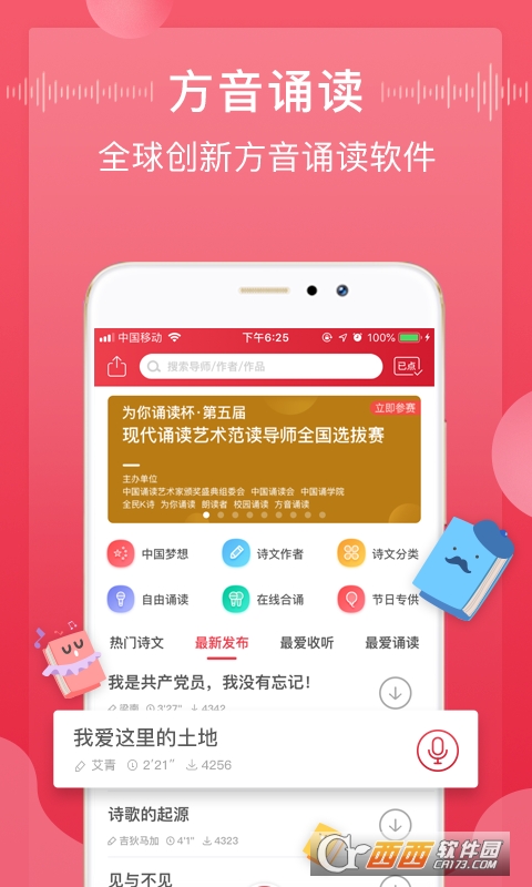 方音诵读手机版是一款全球创新方音配乐诵读软件,方音诵读app为你提供海量素材,也可自写自读,邀请他人诵读,或用普通话,或用方言。朗诵能提高我们对文本的理解能力、鉴赏能力和艺术修养,也能提升我们的语言表达能力。
