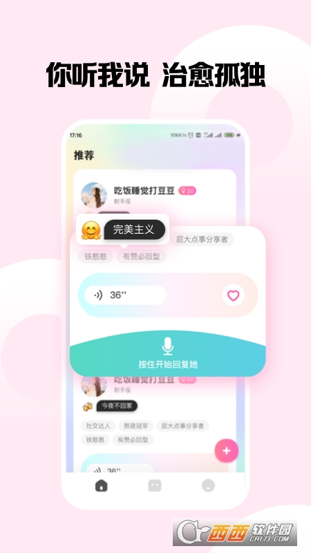 嗨圈圈是一款语音社交app,通过声音寻找真正懂你、与你心灵相通、兴趣相投的人。用户初次注册需通过完成前期“灵魂测试”,匹配与自己兴趣相投的人进行语音聊天,寻找懂你的 TA。