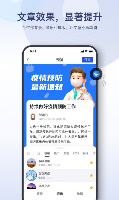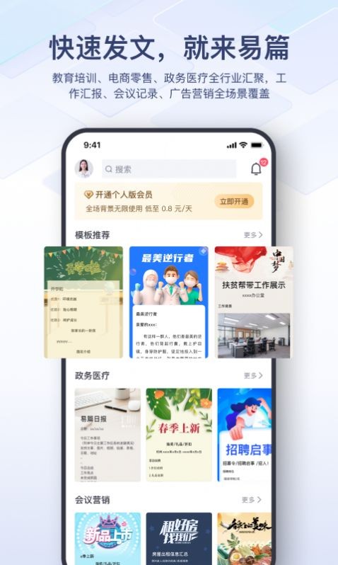 「易篇」是专为工作场景打造的长图文发布工具。支持图片、文字、视频等各种段落类型,提供海量范文模板,制作完成一键分享好友和朋友圈,繁重工作轻松搞定。