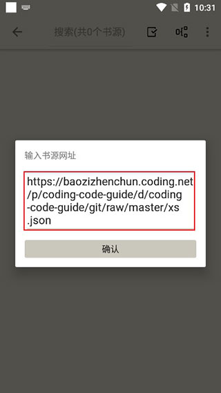 3、然后将上方的书源地址复制到软件输入框中,点击确认;