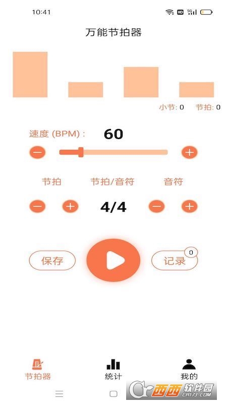 2.相当简洁明快的音乐节拍器,有多种界面颜色选择,有多种节拍音效选择,支持修改节拍速度(相当于摆锤),和修改振铃节拍数(相当于振铃调节拉杆)。