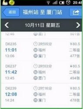 2、返回车票预订界面,输入出发地和目的地,选择乘车日期,查询该日期的列车时刻表;在车次列表中,选择车次,看准列车的出发时间,点击想要的车次进入座位类别选择界面。