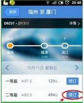 3、选择自己要的座位类别,座位有3种:一等座、二等座和无座,点击预订按钮,进入下一步。