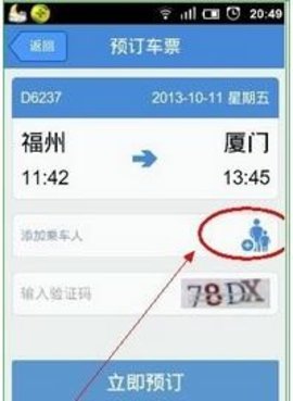 4、添加乘车人,点击人物按钮,进入乘车人员信息界面,可以新添加乘车人信息,也可以选择已有的乘车人,乘车人的必须信息是身份证号。