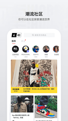3、五个核心功能,包括社区、潮货、发布、消息、我的,给你社区、购物双重体验。