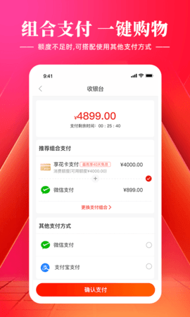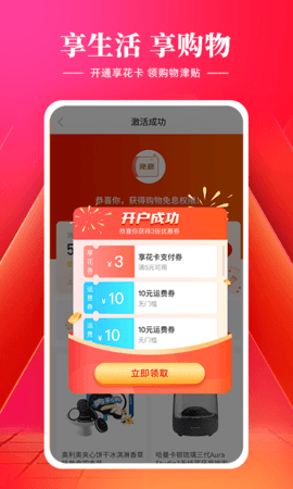 【你消费我买单】可享受先消费后还款的购物体验。海量商品低价购,消费额度全新上线,开通享花卡即有可能获得5万元购物津贴,0元购、1元购、9.9秒杀等专区让你购物不剁手。