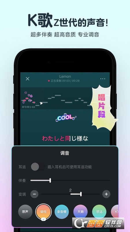 【专业音效】支持8种音效模式自由切换,同时支持用户自定义及使用已保存的歌友创建的优质音效模式,对伴奏进行升降调处理来匹配自己的嗓音。