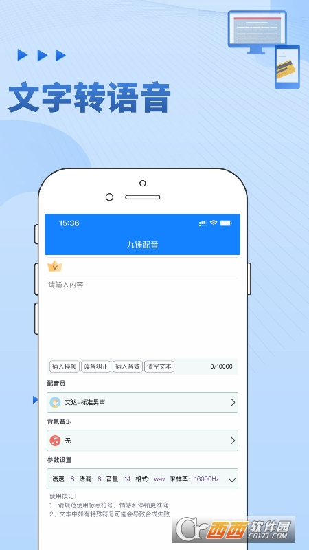 支持插入停顿,读音纠正,可添加背景音乐及音效