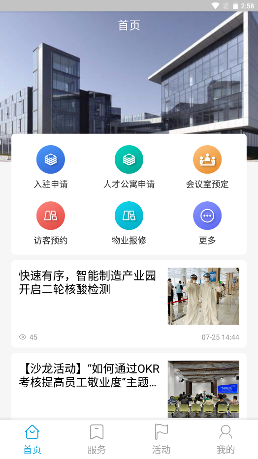 3、园区内的各种各样的活动也会在平台上进行推送,而且用户们可以在平台上登记访客,还可以预约办公室,预约会议室等,提高自己的办公效率;