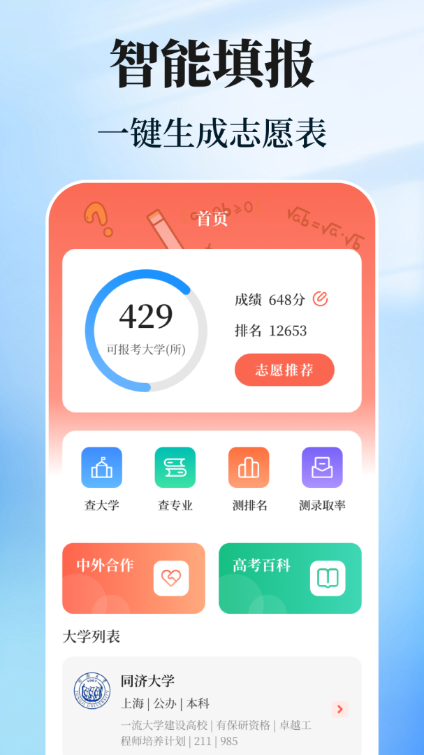 2、能够在这里一键进行智能填报,根据自己的分数来模拟,快速匹配心仪学校。