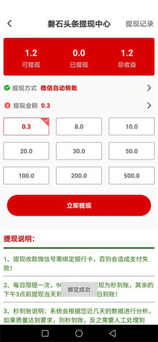 3、磐石头条首次慢0.3元即可填写,后续永久满8元起提取,24小时内审核导致。