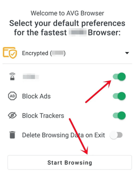 第一次进入浏览器,小伙伴们把第一个开关打开,然后点击Start Browsing就可以了。