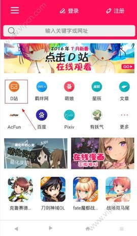 1、打开老司机浏览器APP,在首页中点击D站进入嘀哩嘀哩主页;