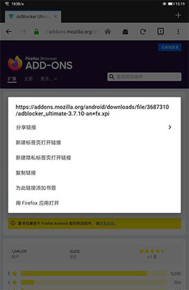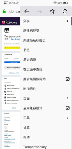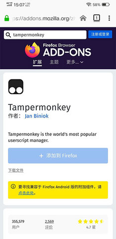 特殊情况,可以在手机模式和电脑模式间切换一次再试试,应该就能搜索到tampermonkey了,如果搜索出来的“添加到Firefox”点击没反应,这时候就要按住这个图标不动,会弹出选项,选择“用Firefox应用打开”,然后在弹出的通知卡中点击”允许“,就ok了