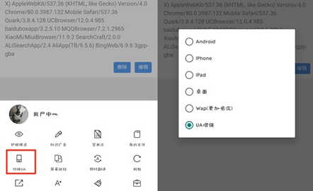 打开浏览器主菜单第二屏,找到选项“切换UA”,把刚才新自定义的UA作为浏览器默认UA。