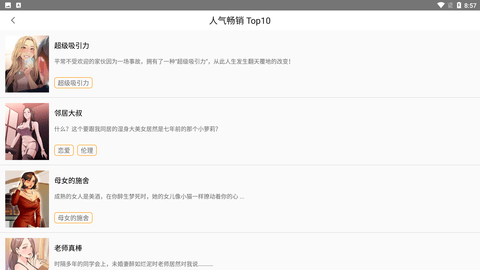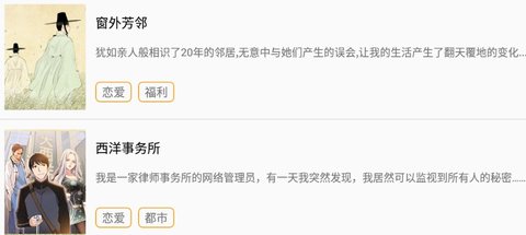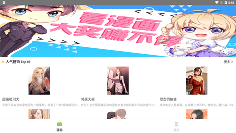 1.漫画的类型多样,不单独突出某一个方面,所有的基本上都有,每天的编辑者都会上架最新的作品;