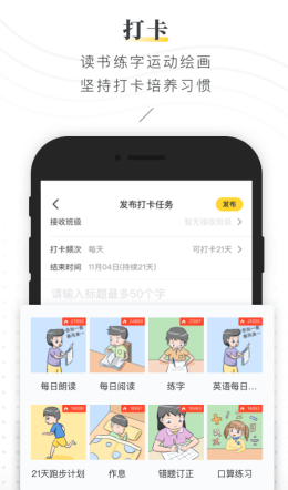 3,教师用户可以为所有的家长以及孩子设计专属的打卡任务模式来进行各种功能的发布,直接提高孩子的管理效率和模式,提高整体的学习情况。