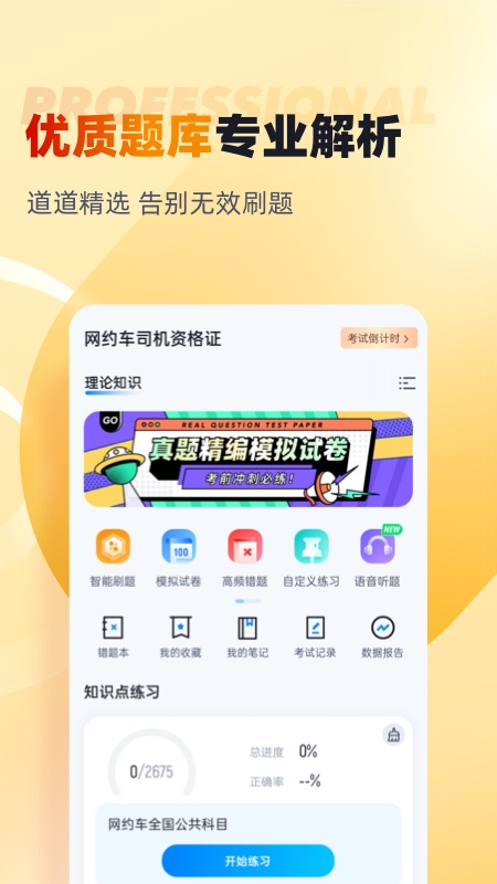 网约车司机题库内含考点练习,全国通用卷以及地区卷模拟练习,以及按照固定考试比重的随机式的抽题的真题考场,