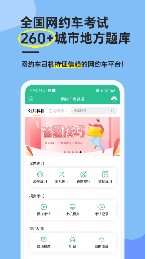 网约车考试通可以帮助您通过司机从业资格考试、C1/C2驾驶证考试和网约车从业资格考试三项考试。