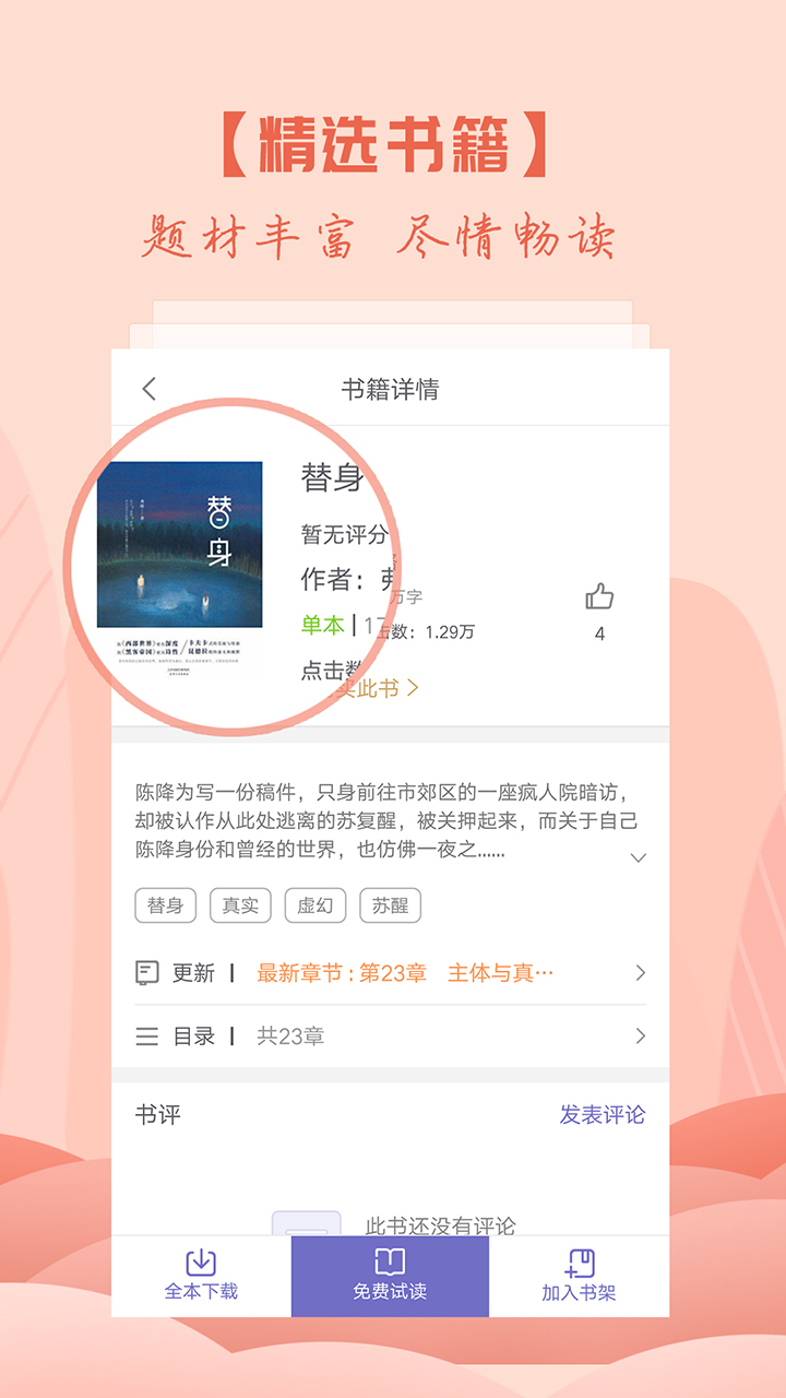 海量内容库:拥有超过数十万本正版小说,从热门畅销书到小众精品作品,应有尽有,满足不同口味的阅读爱好者。