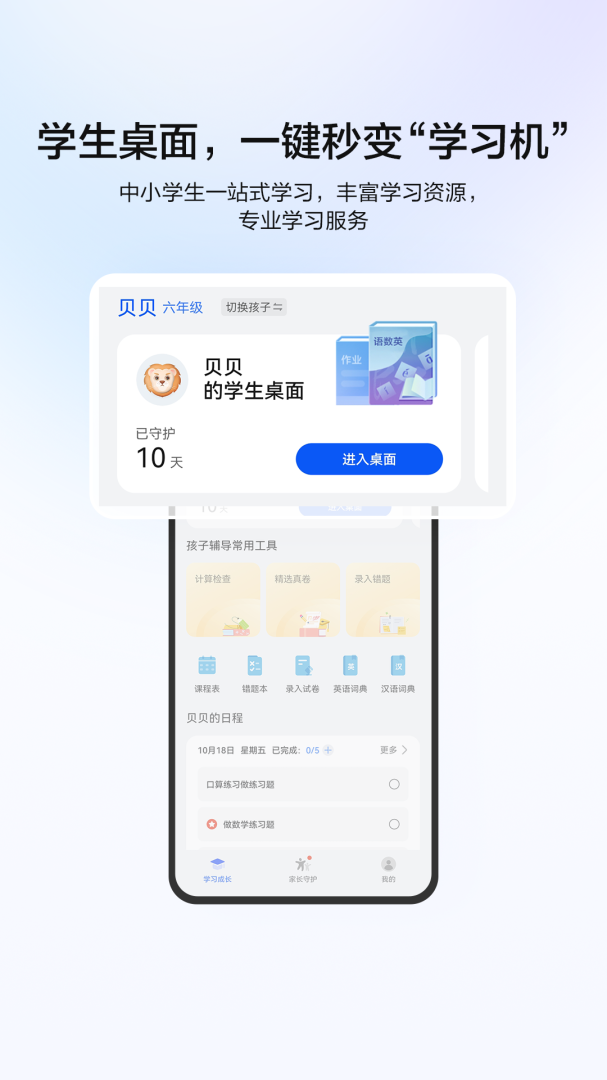 为家长提供一套完善的守护系统,包括学习时长监控、内容筛选、使用时段控制等功能,帮助家长合理安排孩子的学习与休息时间,培养孩子良好的学习习惯和自律能力。