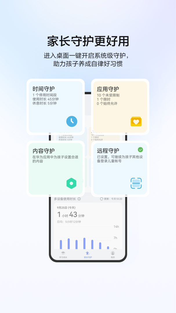 细致入微的守护功能,覆盖使用时间限制、应用访问控制及内容筛选,为孩子营造健康的数字环境。