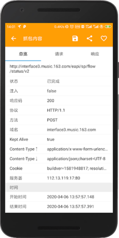 支持浏览一个网络请求的总体概况,包括URL、HTTP协议、HTTP方法、响应码、服务器Host、服务器IP和端口、Content-Type、Keep-Alive、时间信息、数据大小信息等。