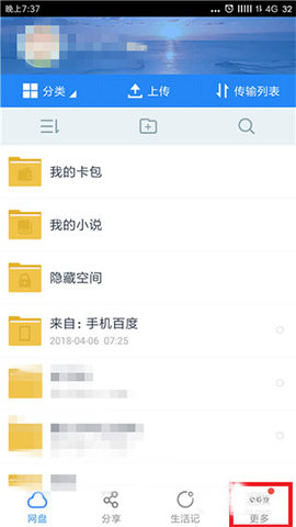 1、打开手机中的百度网盘小米定制版最新版,在百度网盘首页中点击右下角的【更多】;