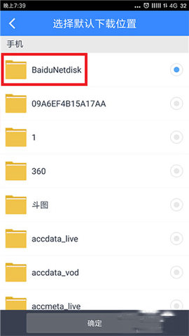 5、当然,如果我们想要自己选择保存文件夹也是可以的,进入到手机存储中选择好文件夹后点击【确定】即可;