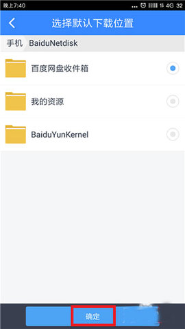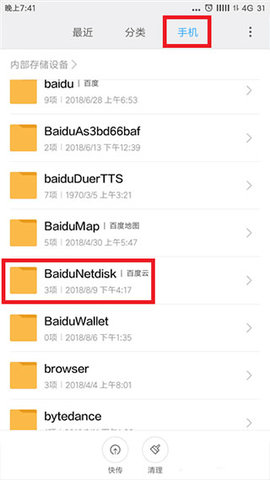 4、接下来进入的就是我们手机中的默认保存文件夹,默认的文件夹名为【BaiduNetdisk】;