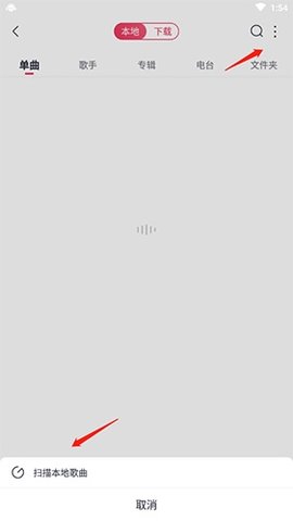 2、点击右上角的“更多”选项,然后点击“扫描本地歌曲”选项即可。