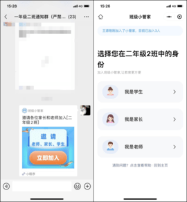进入班级小管家-->班级-->加入班级-->班级口令/管理员手机号-->输入信息保存。加入之后可以切换身份,切换之后两者互不影响。