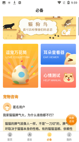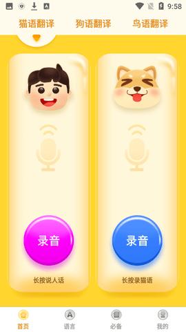 动物翻译器,超火的逗宠神器,基于海量的宠物语言行为数据的分析与运算,保证超高的识别率与转换准确度。即使是脾气最差、性格再高冷的喵星人和汪星人,动物翻译器也能轻松搞定。