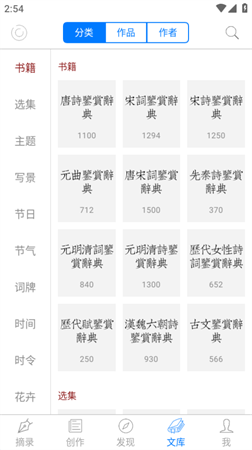 【精选分类】对100万诗词进行分类,包括:选集、主题、写景、节日、节气、词牌、时令、课本等。
