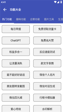 点击主页的功能大全即可进入到如图所示的页面中,大家可以根据自己的如图所示的分类进行筛选相关的辅助工具,这里包含了图片编辑工具、生活工具、趣味性功能等等这些!
