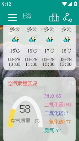 2、空气质量:提供实时空气质量指数;并加入雾霾天气预报。