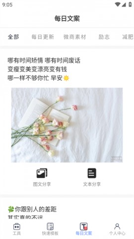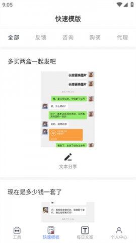 2.在快速模板中,用户可以进行微信等模板的素材制作,并可以长按进行图片的更换,还可以进行文本等内容的分享。