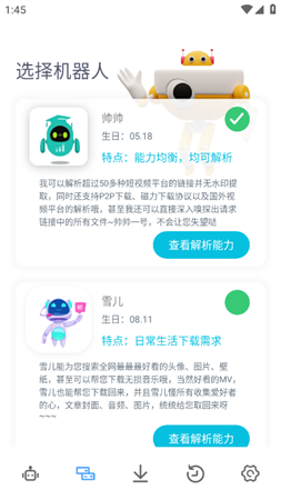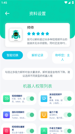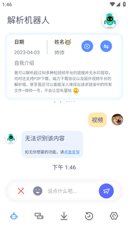 功能非常丰富,目前可以解析超过50多种短视频平台链接,无水印提取视频,而且还支持P2P下载、磁力下载、资源嗅探等等。打开软件,界面是以机器人聊天对话这种模式的,界面顶部有机器人的详细资料,可以点击切换机器人,每一个机器人的功能都是不一样的。