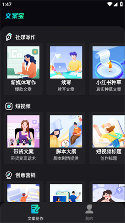 一款提供灵感创意,广告文案等海量文案句子的APP。包含当下实用热门多种文案样式,输入要求即可生成对应的文案轻松快捷,帮你轻松解决各方面的文案难题。