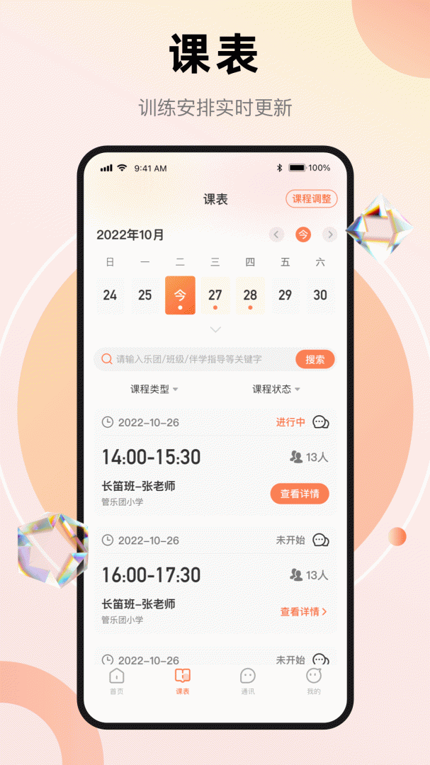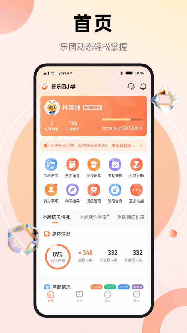 4、管理端适用于乐团管理员,从乐团排课、考勤、课后作业、阶段自测全方位管理乐团整理训练情况