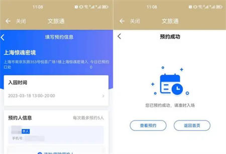 点击景点/景区的“预约”键(以上海惊魂密境举例)→点击“免费预约”→选择入园时间和预约人信息